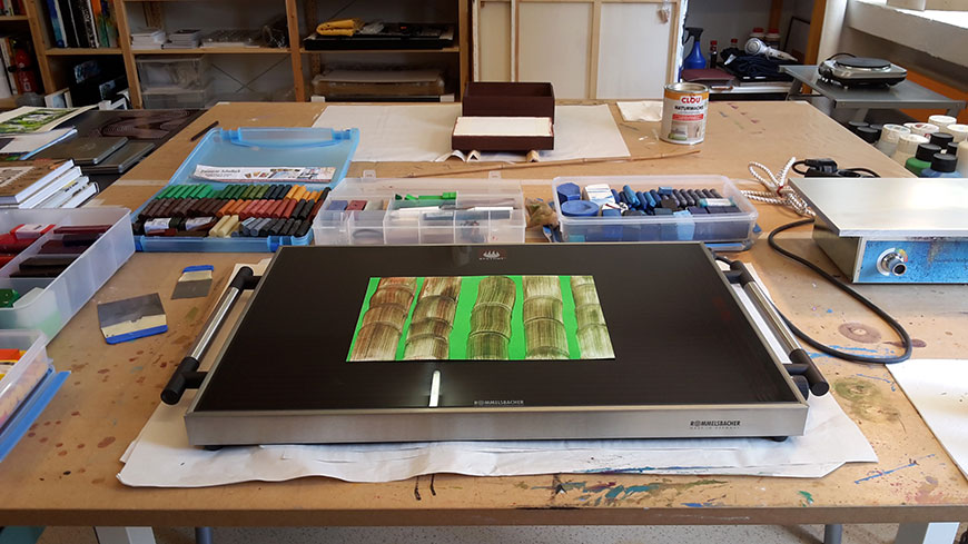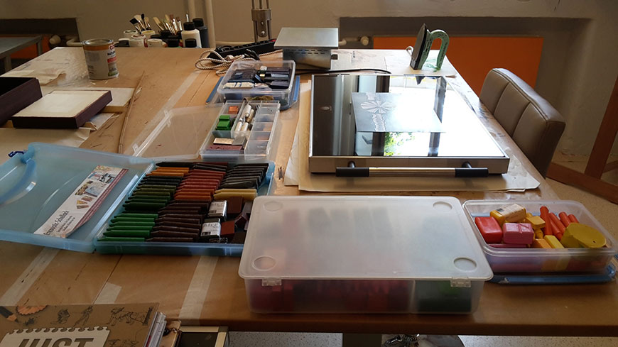Zwei Jahre später stieß ich zufällig auf ein Video von Monika Romer und der Encaustic-Academie. Sofort war ich gefesselt und fasziniert von den wunderbaren Techniken und den Farben der Encaustic.